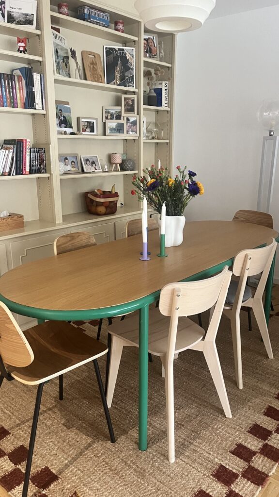 Cette table à manger a été mon point de départ pour la conception de cette pièce. Ce vert primaire, vif, frais et original m’a inspiré. J’ai voulu le mettre en valeur en ajoutant d’autres couleurs vives. Mon conseil : partez de ce que vous avez et créez autour !